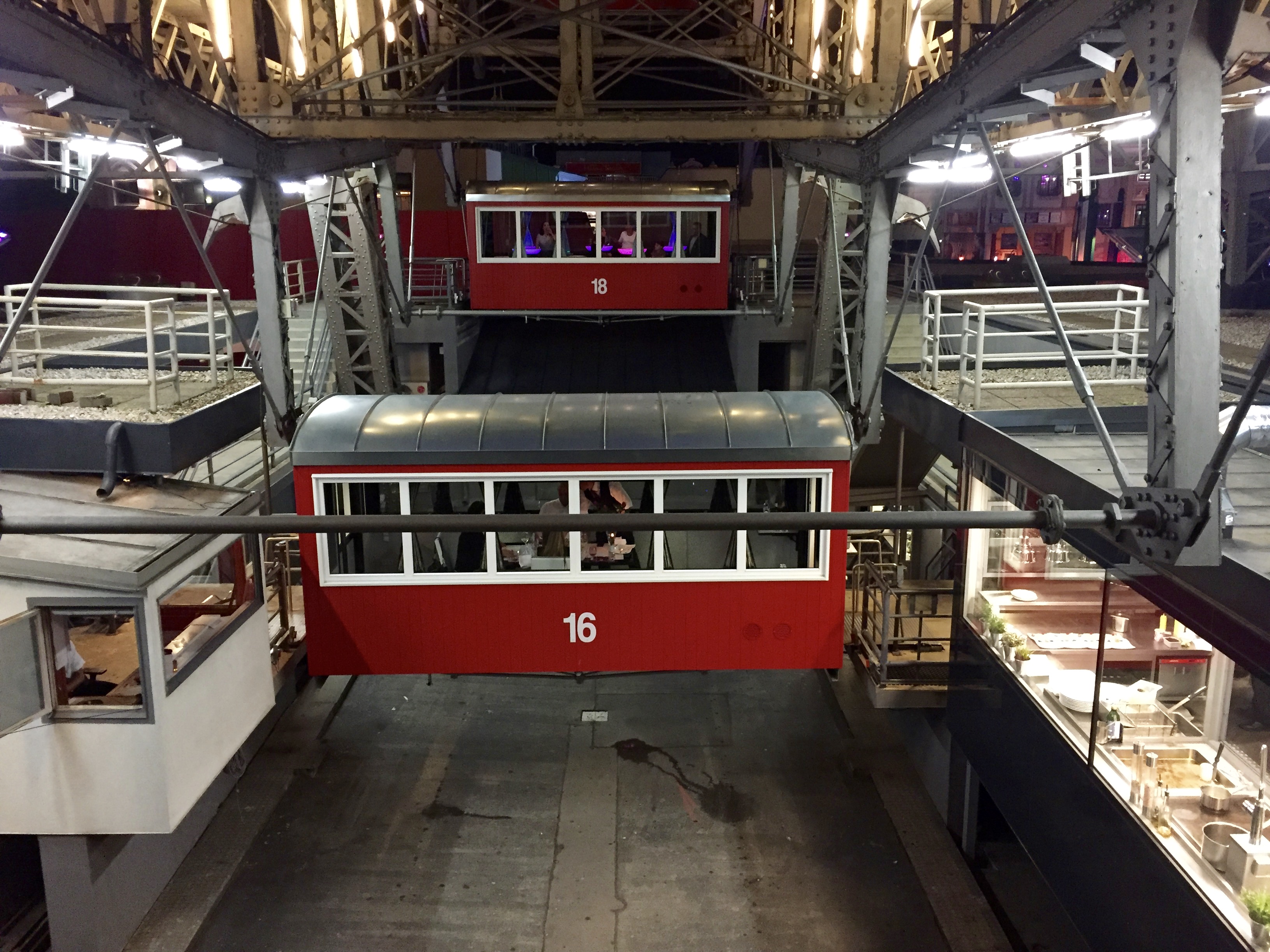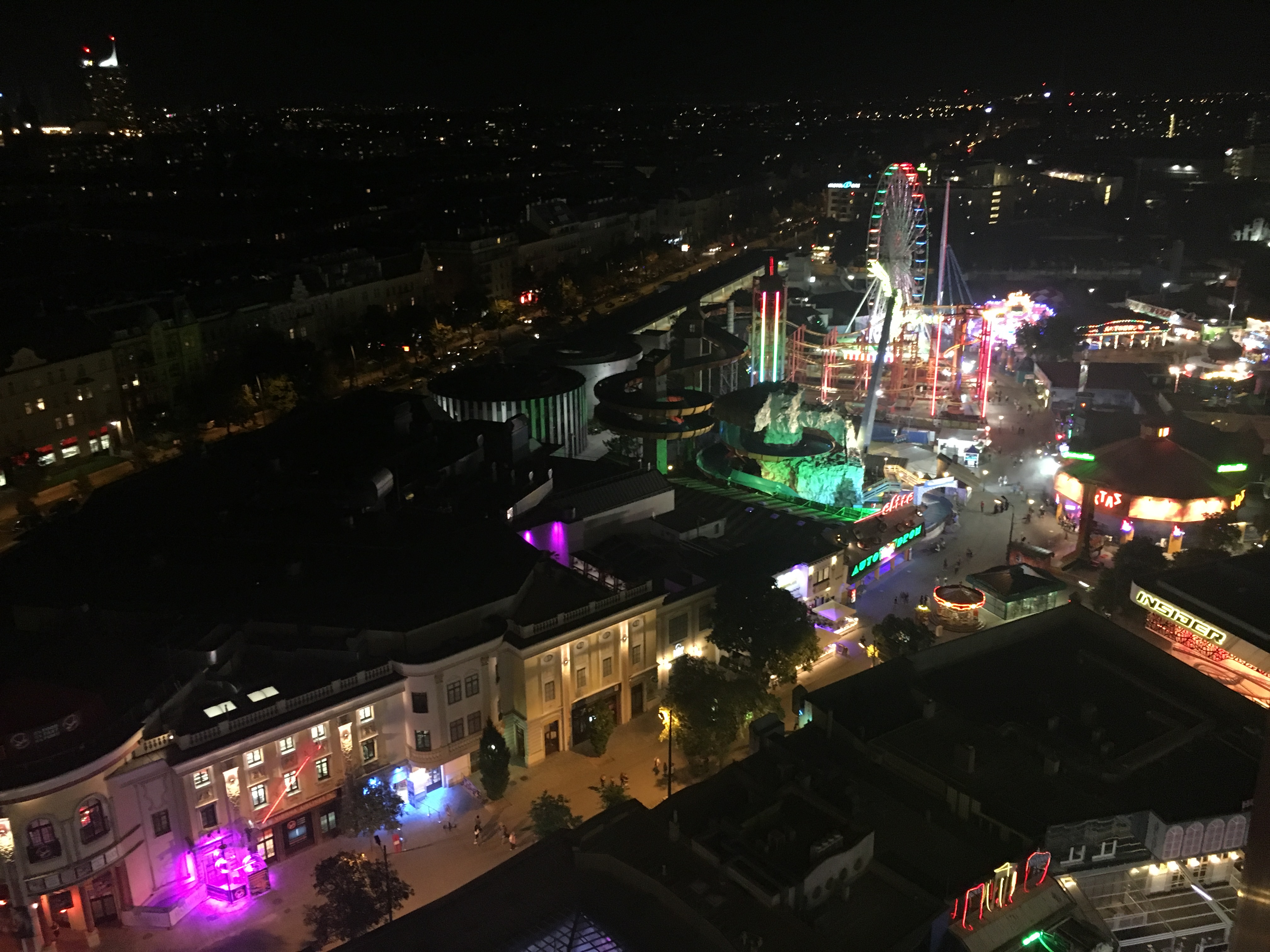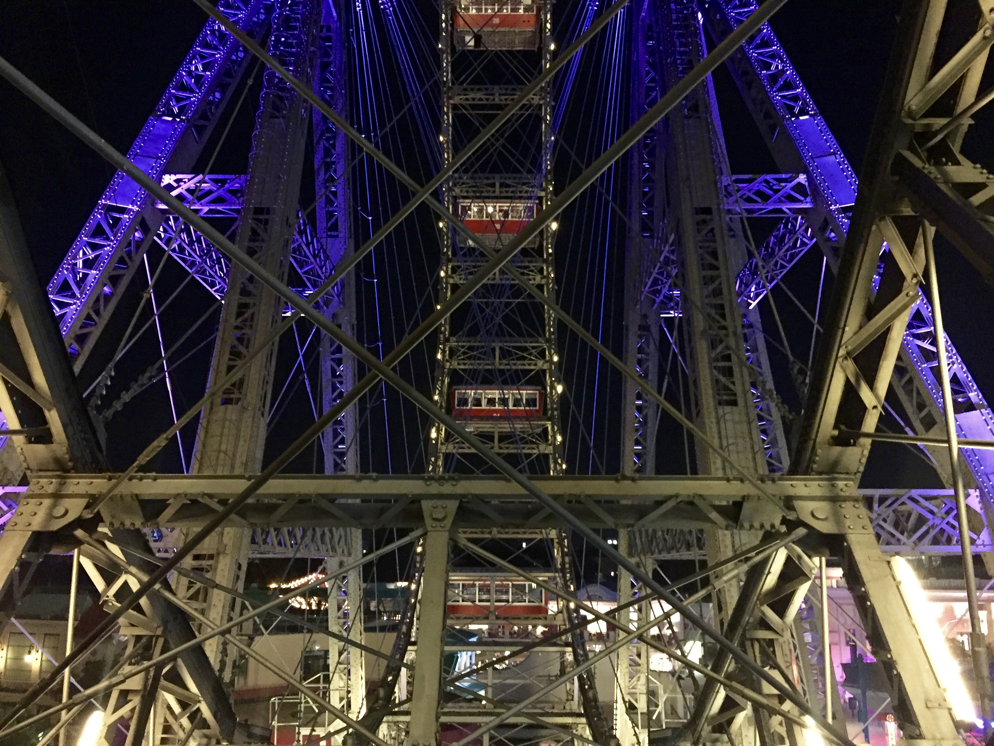 Afterward, we continued over to the park for our own romantic night ride on the Ferris wheel. Once we entered the Prater Amusement Park, we easily found the entrance and waited our turn. We noticed a few Ferris wheel cars packed with people, while others were set up for a romantic dinner for two. Now I see what Paul had arranged. The air was cool, the lights were glowing softly, and the staff were gently offering the dinner courses in an organized sequence complimenting the evening. For our ride, however, we loaded up in the economy car, luckily with only about 7-8 other people. The views as we went around the wheel were lovely, with the city lights spread in all directions. It was the perfect way to begin our time here.