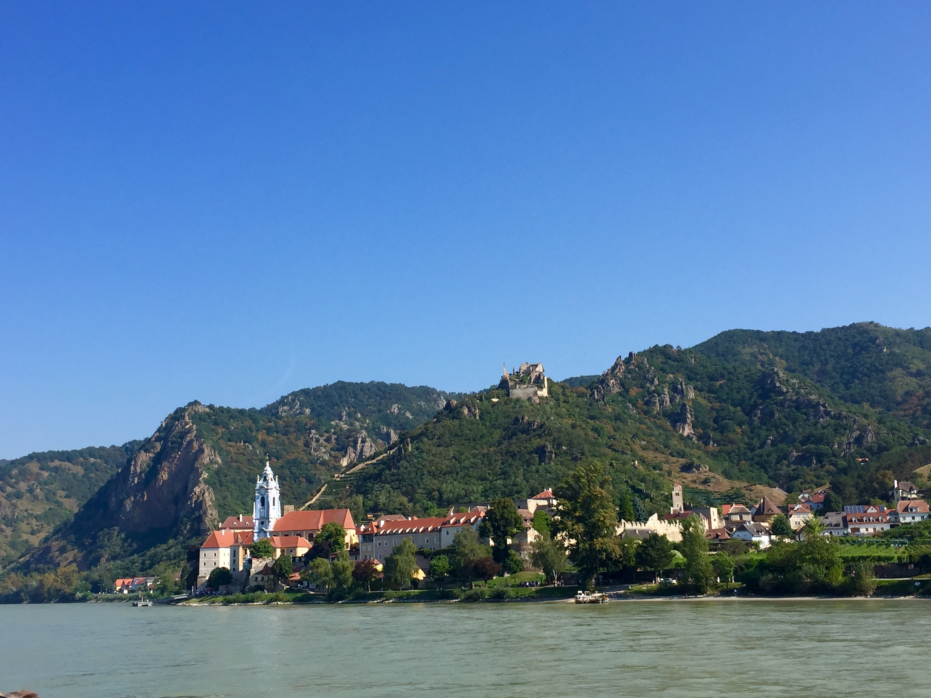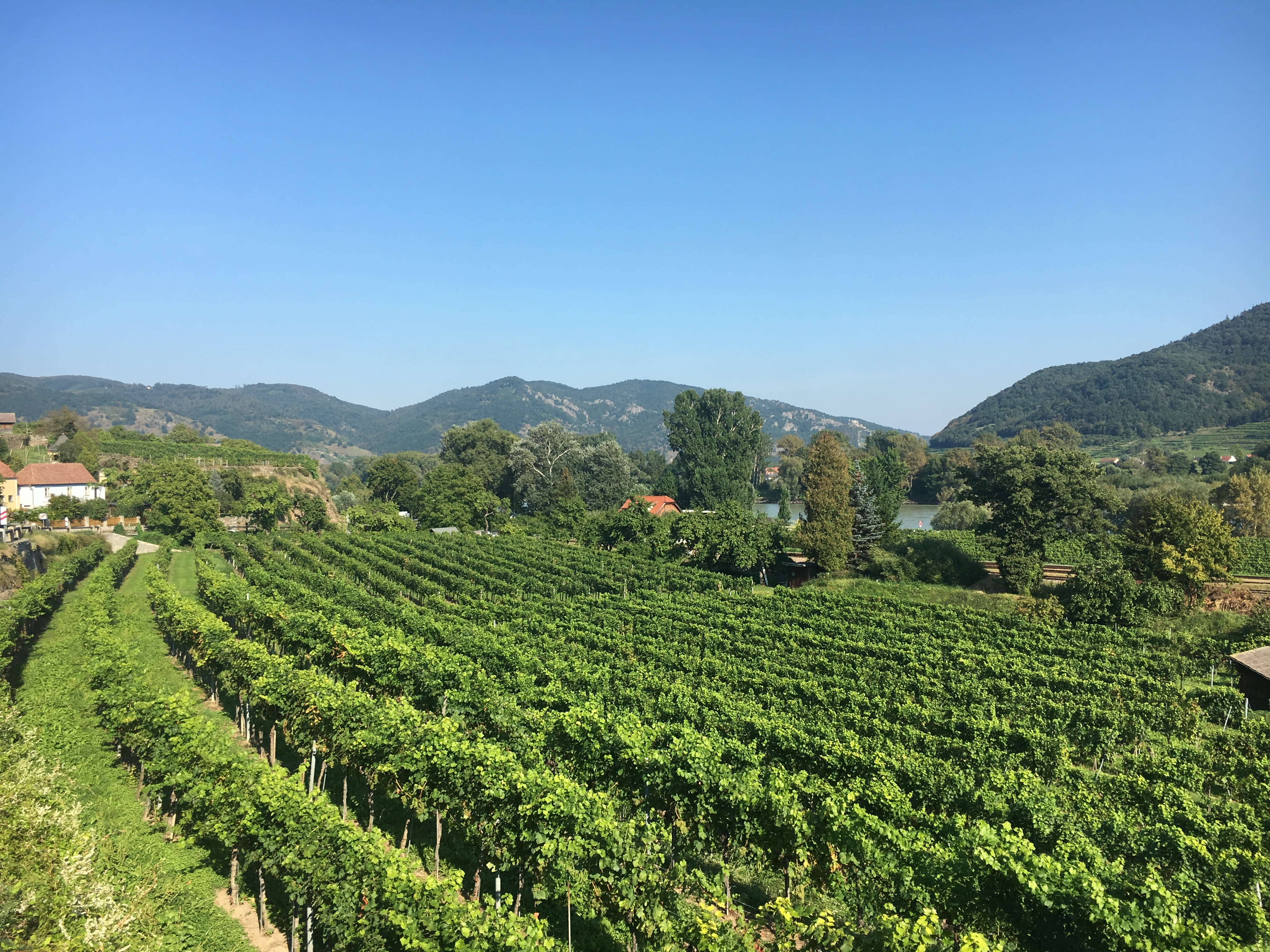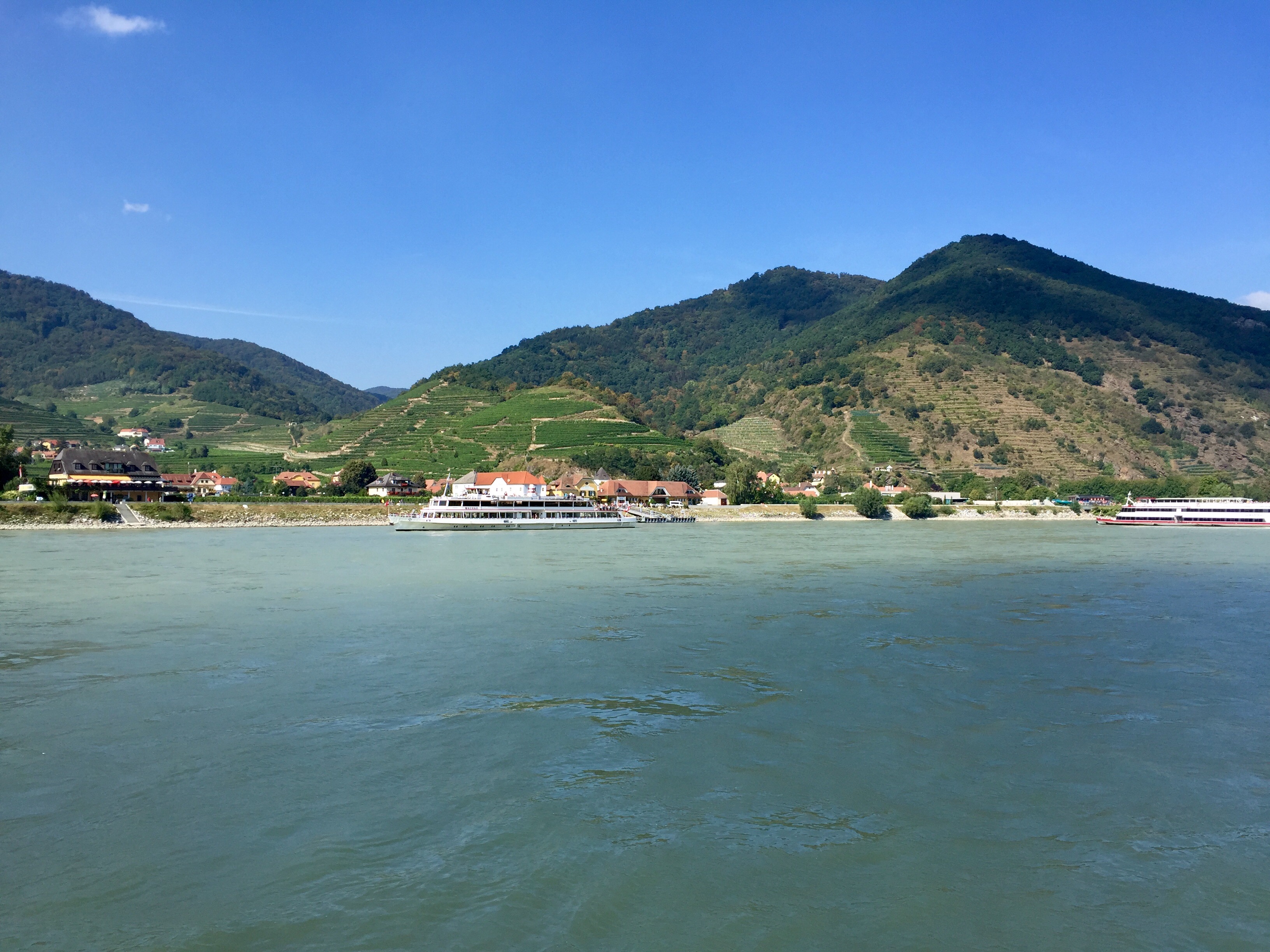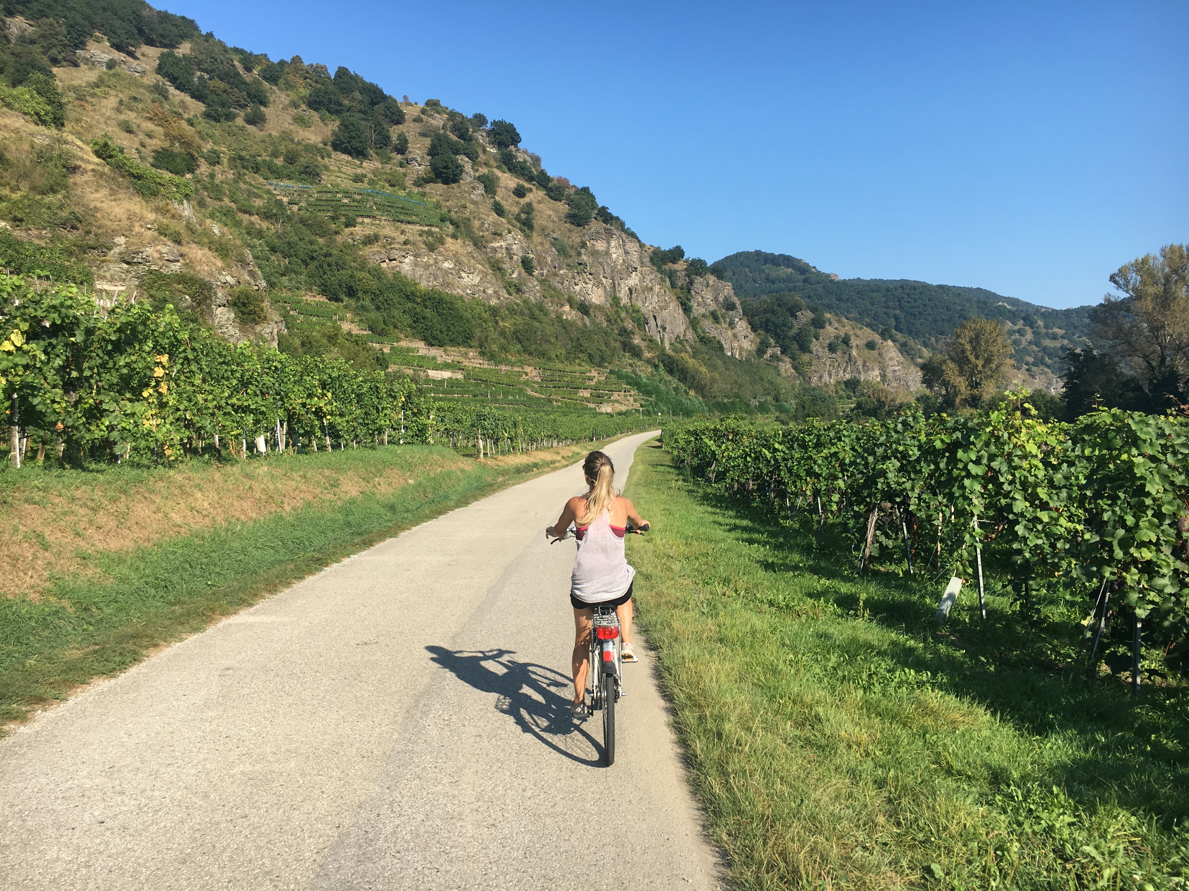 Instead, we headed off on the bike trail running along the edge of the river. We passed numerous farms and vineyards breathing in the fresh air and enjoying the outdoors. There are a couple crossings along the way via a small ferry that simply crosses the river, (there were no bridges in this area). We slowly took this relaxing ride stopping every so often for pictures. Whitney even selected a cute little vineyard in the small town of Weissenkirchen to savor a glass of the local wine and take a little break. It was one of the most pleasurable bike rides we’ve had and would definitely do it again. Tip: don’t bike ride up stream, the people going in that direction looked miserable.