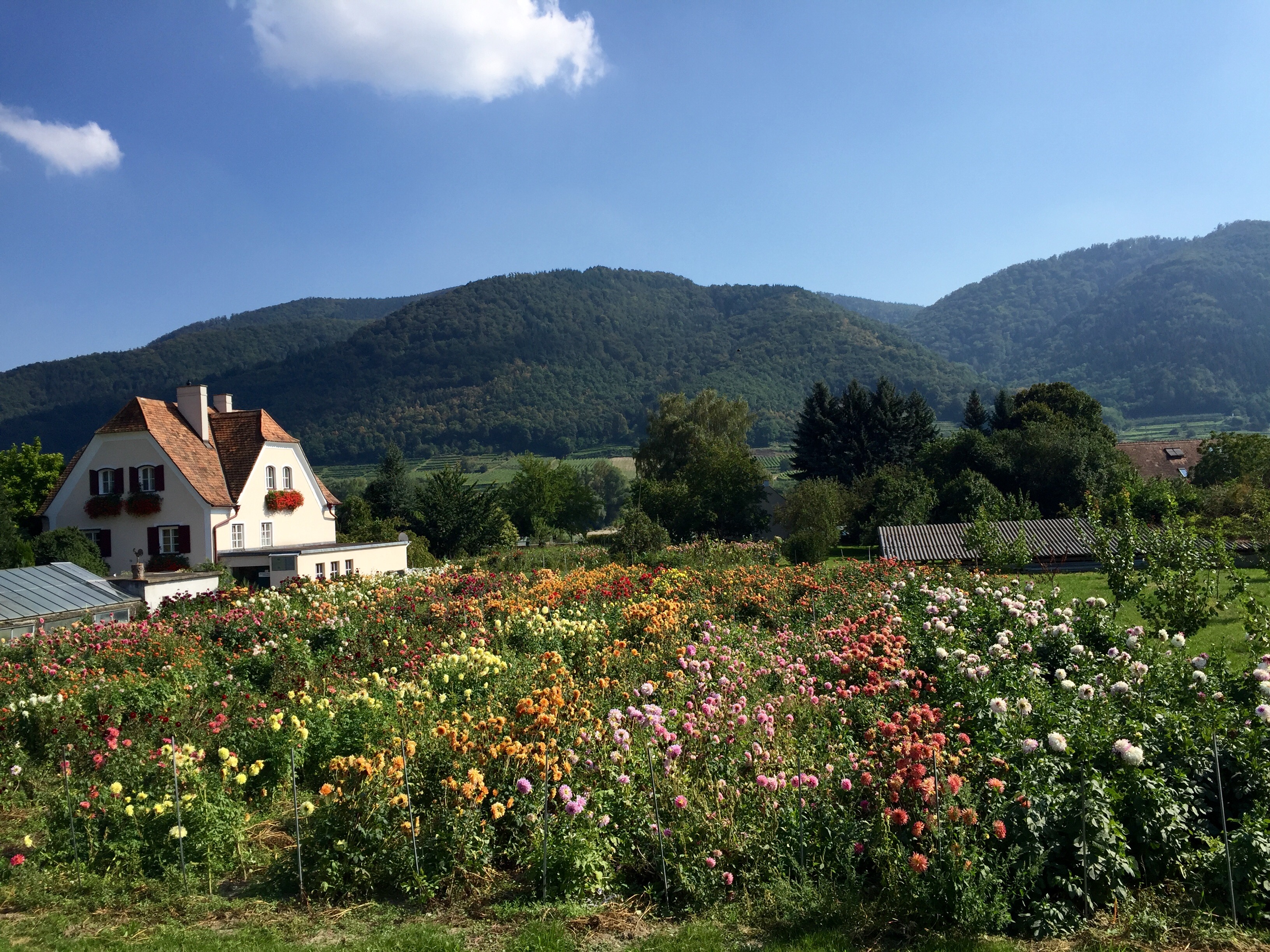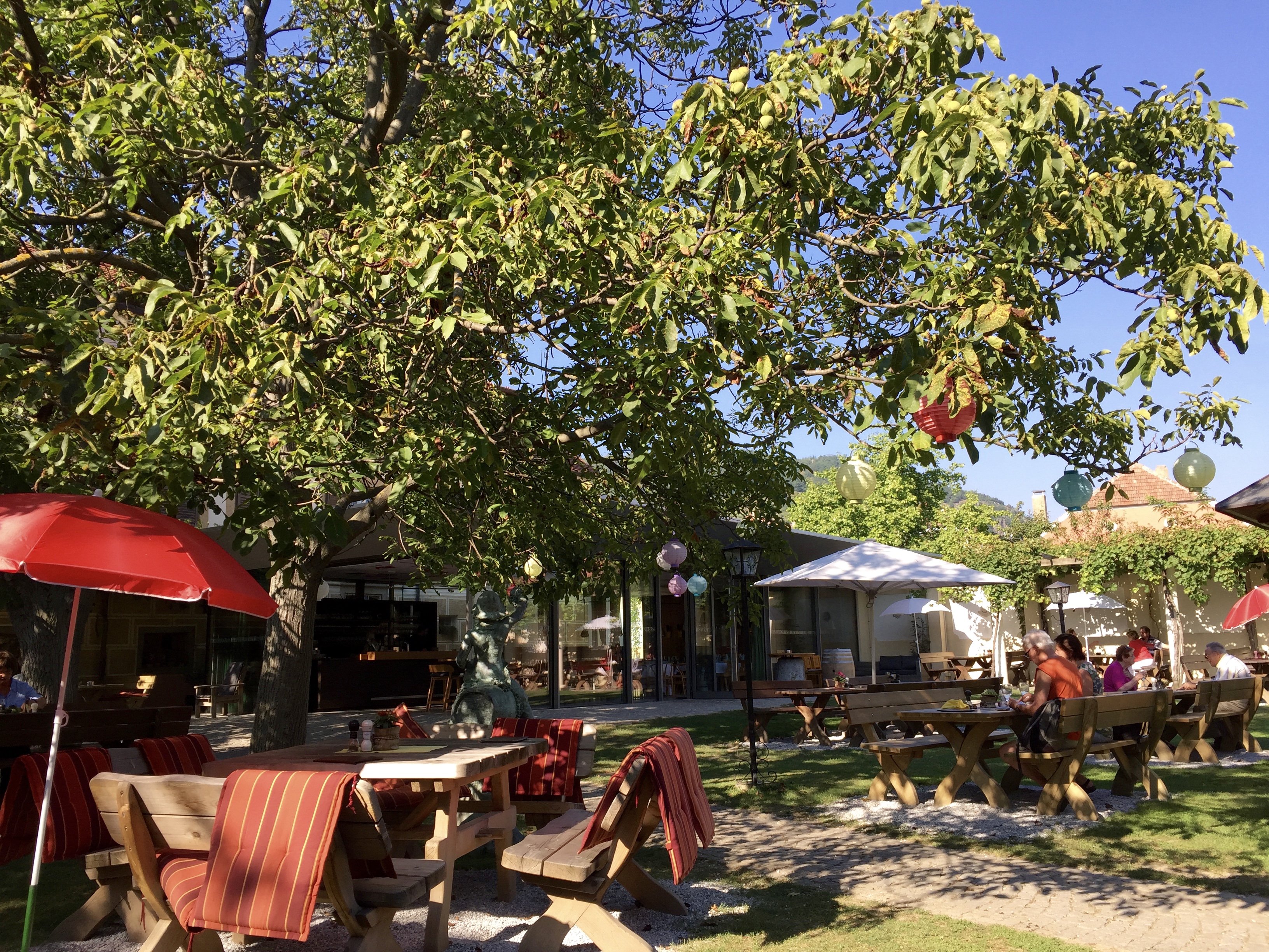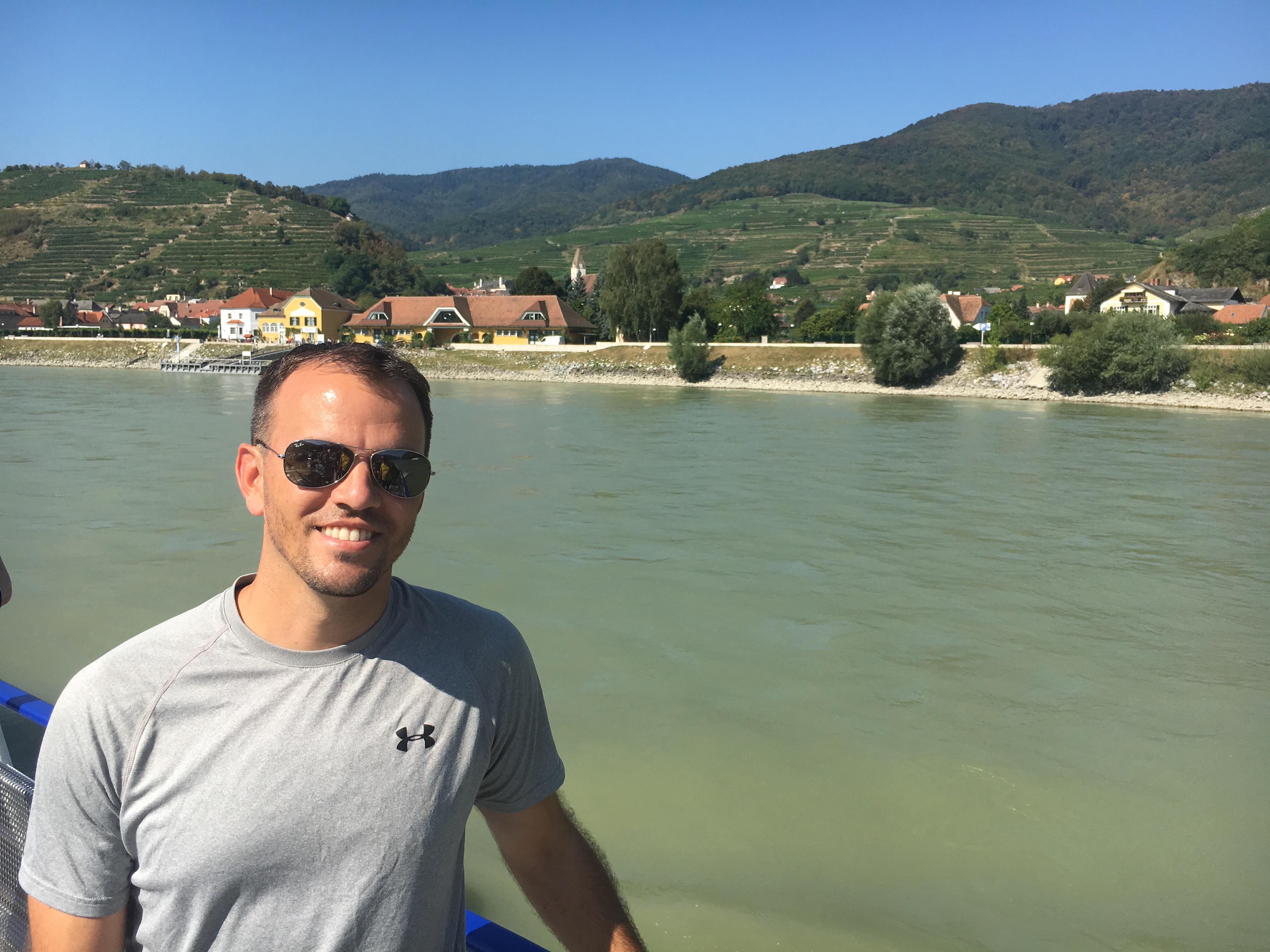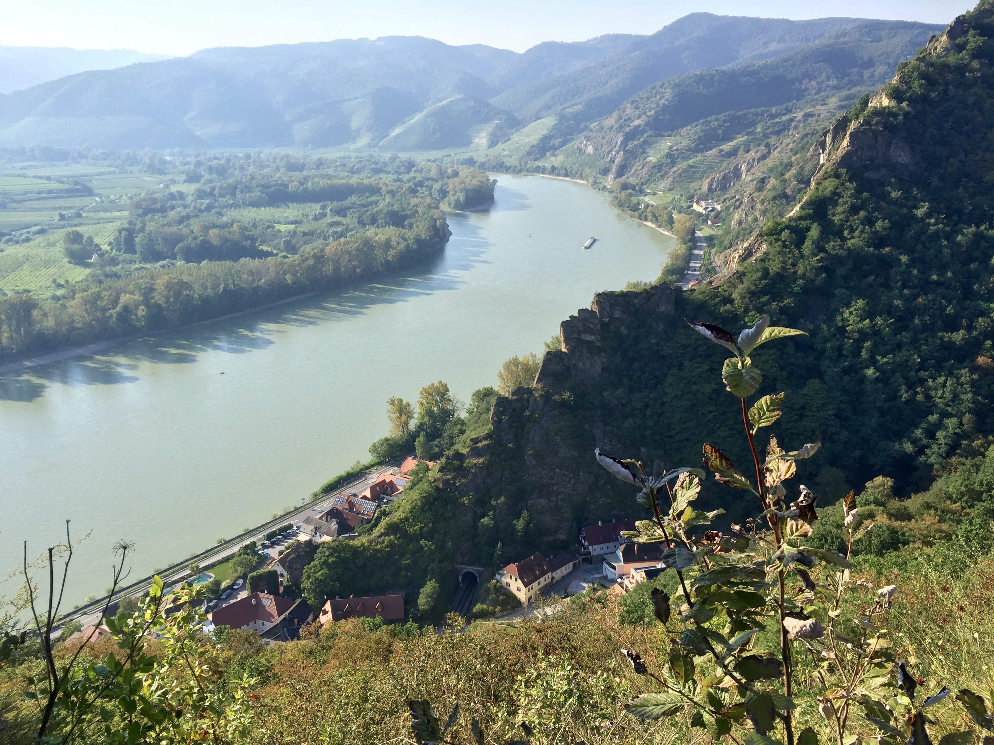 Instead, we headed off on the bike trail running along the edge of the river. We passed numerous farms and vineyards breathing in the fresh air and enjoying the outdoors. There are a couple crossings along the way via a small ferry that simply crosses the river, (there were no bridges in this area). We slowly took this relaxing ride stopping every so often for pictures. Whitney even selected a cute little vineyard in the small town of Weissenkirchen to savor a glass of the local wine and take a little break. It was one of the most pleasurable bike rides we’ve had and would definitely do it again. Tip: don’t bike ride up stream, the people going in that direction looked miserable.
